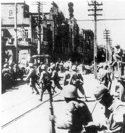 ⑤1937年7月30日中国军队撤出后,日军以疯狂报复的方式,派飞机对天津东站、北站、省政府和市政府、警察局、南开大学、北宁铁路局及电台、造币厂、法院等重要目标进行狂轰滥炸;日军进入市区后在街头对手无寸铁的居民随意开枪开炮,很多地方炸为废墟,街道遍布死尸,到处是无家可归的难民。日军的暴行给天津和天津人民造成的损失与痛苦罄竹难书。7月31日天津沦陷,8月1日日军操纵下的汉奸临时政府——天津市治安维持会成立,天津在日伪政权统治下开始了长达8年的痛苦不堪的沦陷生活。图为被日军飞机炸毁的河北省政府(今金钢公园处)和天津沦陷后日军进入天津。