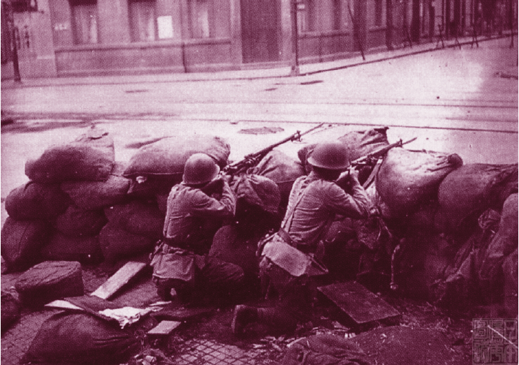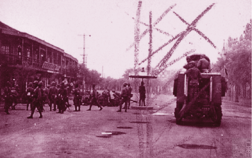 1937年7月28日,驻通县的“冀东防共自治政府”的保安队宣布起义,向通县日军兵营等处发动攻击,日军忙于应付通县起义,天津日军兵力薄弱。中国第二十九军决定集中第三十八师驻津部队和天津保安队,奋起抗战,出击天津日军。7月29日凌晨,进攻开始。图为日军与中国军队在天津激战。