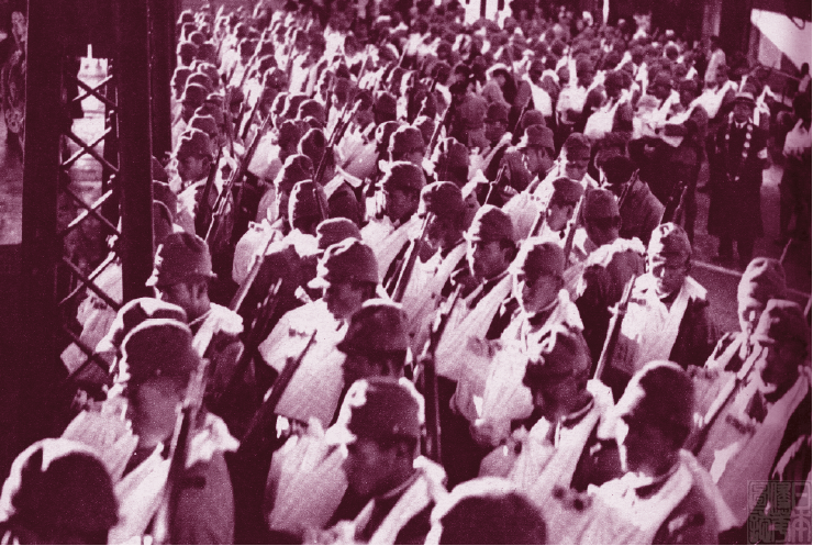 除天津的日本侨民组织“义勇队”参加攻击中国军队外,日本青年男学生也积极加入。图为日租界芙蓉街上的青年学校的男学生手持枪械准备出动。