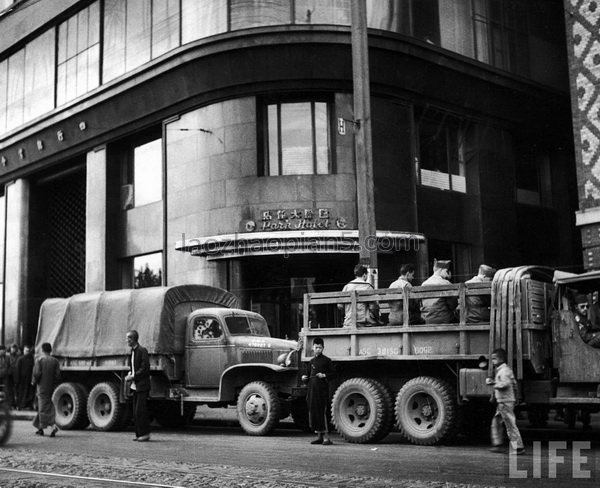 1945年11月,上海。国际大饭店门口的美国军用卡车,这批美军官兵准备入住这间酒店。