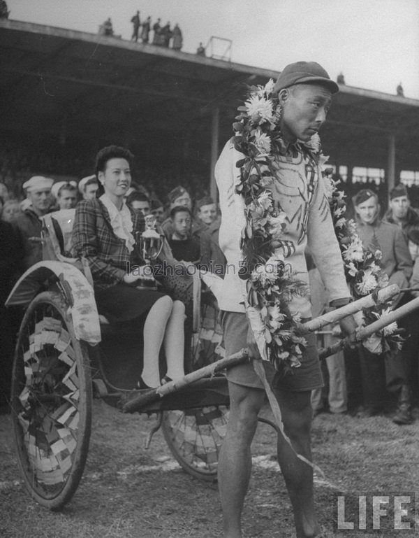 1945年11月,上海。黄包车比赛优胜者戴上市民敬献的鲜花。