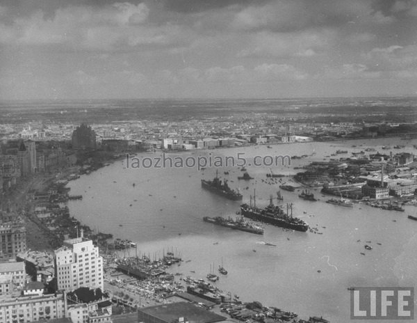 1945年11月,上海。城市鸟瞰,黄浦江中是一艘美国舰艇,这座庞大的城市沿着黄浦江左岸铺开直到长江。