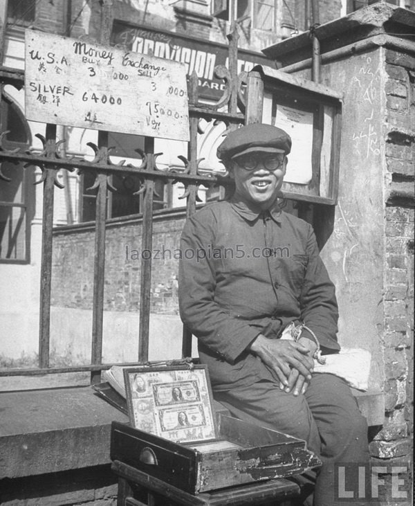 1945年11月,上海。街头炒汇者,他的身后写着当天的美元、银洋的比价,这座城市是当时远东最大的金融中心。