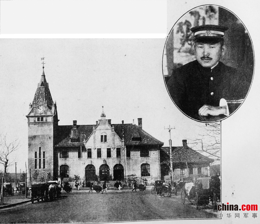 12-1918年的青岛火车站主楼。右上人物照片为站长堀次郎。〔和气六郎:《青岛写真案内》,第182页〕