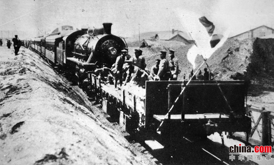 22-日军步兵第四十七联队乘火车向济南进发的情景。挂在火车车头前的是一节用于防御的车厢底座,底座最前面插有两面日本国旗。〔日本明信片《济南事变实况》〕