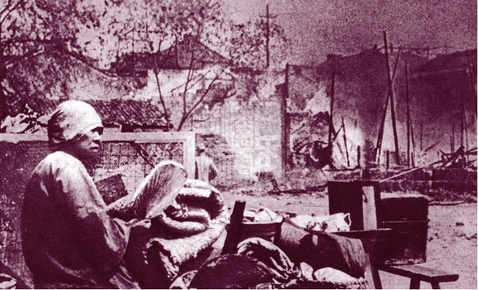 1938年10月,日军进攻武汉时,许多民房中弹燃烧。