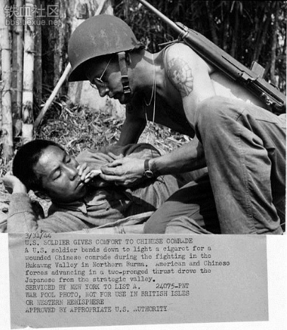 1944年3月31日 美军士兵慰问中国战友, 在缅甸北部的胡康河谷,一名美军士兵弯下腰来给一名中国伤员点燃香烟。中美联军犹如两把锋利的叉子刺向日军,将敌人逐出了具有战略地位的胡康河谷