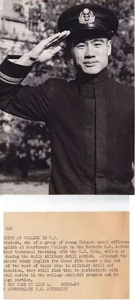 一个中国学生在训练敬礼和微笑。这个学生是来美国东部斯瓦特莫学院进行语言和技术培训的青年海军军官中的一员。这些中国学生每天要学习五个小时的英语,并且把剩余时间全花在军训和体育课上,但是,他们仍然能够找时间参加学校的运动俱乐部和学生联欢会活动。