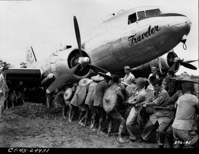 1945年6月13号,在中国南宁,一群中国民工和中美士兵携手将一架C-47型运输机拖出一个充满泥浆的炸弹坑,该机场刚刚从日军手中夺取。