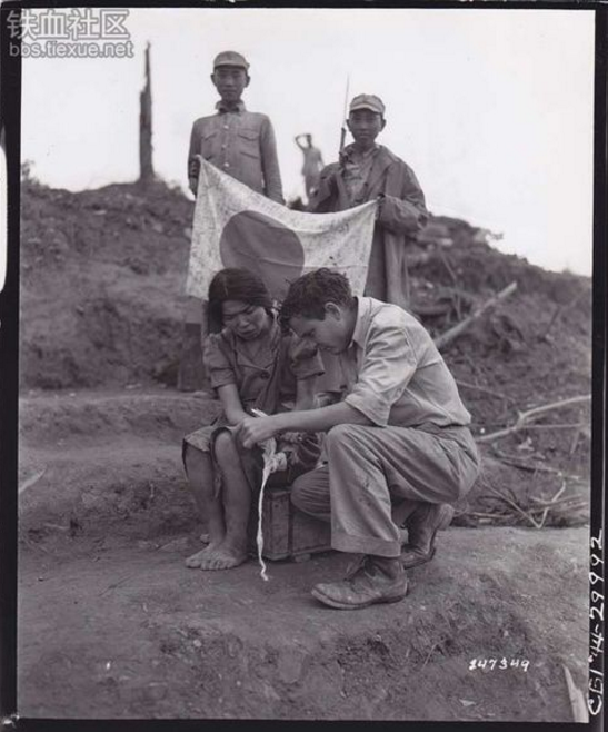 来自俄克拉荷马的第五技术兵梅尔•L•汀斯利正在给一日本女子进行紧急救护。这名日本女子在中国第八军收复松山阵地时受伤被擒。两名中国士兵在展示俘获的日军旗帜。1944年9月7日