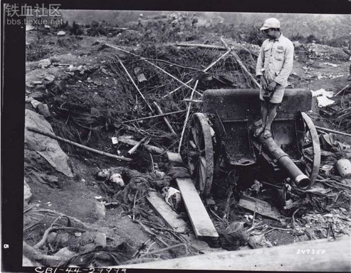 1944年9月8日,一名中国士兵站在一台刚刚缴获的火炮上。中国第八陆军炸毁了日军占领的碉堡,剿灭十五名日军。