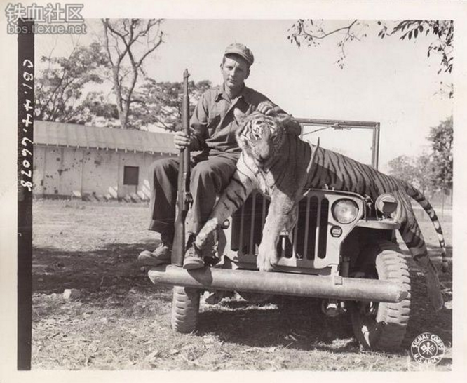 来自伊利诺伊的第二七四连下士C•A•麦克拉里是战地军警,正在密支那展示一只“食人虎”。这是老虎足有二百五十磅重,十二英尺长。
