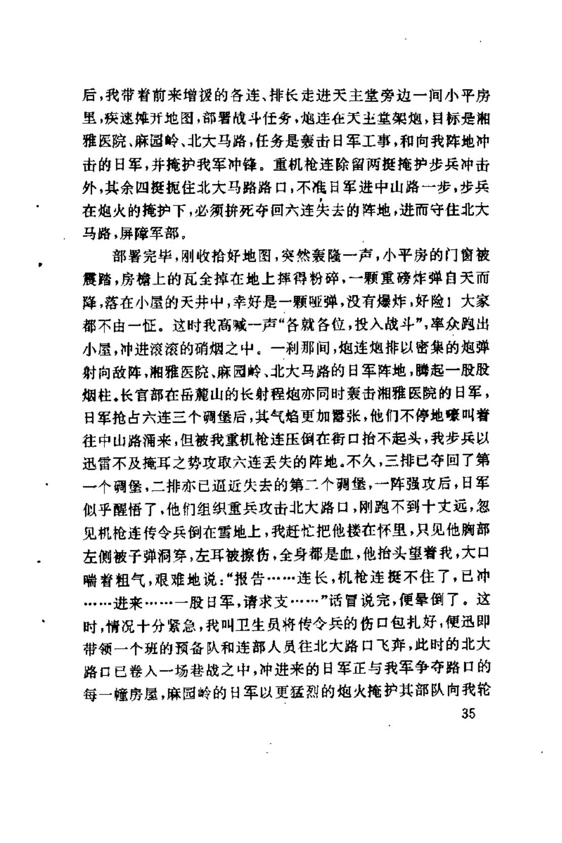 部署完毕,刚收拾好地图,突然轰隆一声,小平房的门窗被震踏,房檐上的瓦全掉在地上摔得粉碎,一颗重磅炸弹自天而降,落在小屋的天井中,幸好是一颗哑弹,没有爆炸,好险!大家都不由一怔。这时我高喊一声“各就各位,投入战斗”,率众跑出小屋,冲进滚滚的硝烟之中。一利那间,炮连炮排以密集的炮弹射向敌阵,湘雅医院、麻园岭、北大马路的日军阵地,腾起一股股烟柱。长官部在岳麓山的长射程炮亦同时轰击湘雅医院的日军,日军抢占六连三个碉堡后,其气焰更加鬻张,他们不停地嘹叫者往中山路涌来,但被我重机枪连压倒在街口抬不起头,我步兵以迅雷不及掩耳之势攻取六连丢失的阵地。不久,三排已夺回了第一个碉堡,二排亦已通近失去的第二个到堡,一阵强攻后,日军似乎醒悟了,他们组织重兵攻击北大路口,刚跑不到十丈远,忽见机枪连传令兵倒在雪地上,我赶忙把他搂在怀里,只见他胸部左侧被子弹洞穿,左耳被擦伤,全身都是血,他抬头望着我,大口喘着粗气,艰难地说:“报告……连长,机枪连挺不住了,已冲……进来……一股日军,请求支……”话冒说完,便晕倒了。这时,情况十分紧急,我叫卫生员将传令兵的伤口包扎好,便迅即带领一个班的预备队和连部人员往北大路口飞奔,此时的北大路口已卷入一场巷战之中,冲进来的日军正与我军争夺路口的每一幢房屋,麻园岭的日军以更猛烈的炮火掩护其部队向我轮番冲锋,路口一幢木结构两层楼房里,日军一挺机枪向我占据的房屋扫射。我带领预备班以神速的动作越过街心;闪身进入楼房,登上二楼,一顿猛射。五个日军来不及转身便栽倒了。此时三排长赵金良(浙江人)也带一个班从碉堡里杀出来。麻园岭日军的炮兵,自恃占据有利地形,对着北大路口袭击。炮弹不时在我们身边爆炸,我传令天主堂的炮连、炮排压住麻园岭日军的火力,掩护步兵冲锋,炮连炮排集中火力攻打麻园岭,把整个麻园岭几乎掀翻了。与此同时,我们与窜进路口的日军展开了肉搏,一时杀声四起,战士们身上溅满了血。北大路口的敌人被我这死命的攻击所震慑,加之失去麻园岭炮火的策应,军心动摇,开始溃退。此时传令兵报告,最后一个弱堡已被三排夺同,全部抢回了六连失去的阵地,士兵们听了这胜利的消息,无不为之振奋。在此形势下,我们进而奉命发起了突击前进,合围北大路口,全歼路口之敌的攻势,士兵们纷纷向前突进,合围圈渐渐缩拢。我正准备从楼上下来,只听三排长赵金良惊呼:“前面滚进来一个敌人。”顺着他指的方向一看,一个日军从我们斜对角的平房里冲出来,几个翻身便滚进北大马路,跃到我们房脚下,对着我们架起了机枪。三排长对着墙下“砰”的一枪,这日军还来不及扣枪机便翻倒在地。不一会,平房里又滚出两名日军,连枪带尸拖着就跑。我们奔下楼来,尾追不舍。两名日军见势不妙,赶忙弃下尸体,就势架起机枪,我军一新兵眼疾手快,迅步向前,甩出一颗手榴弹,“轰隆”一声,敌人连人带枪一齐被炸飞了。四连突破日军的火力,也冲杀上来,向我连靠拢,形成夹击之势,尽管敌人无休止地轮番冲击,始终未越北大马路一步。