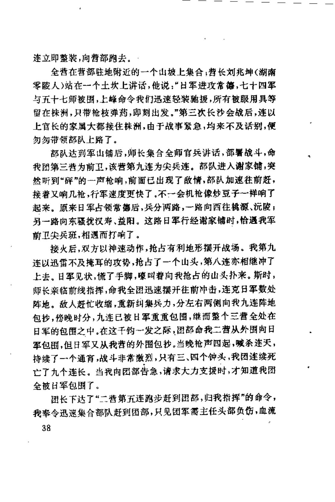 接火后,双方以神速动作,抢占有利地形摆开战场。我第九连以迅雷不及掩耳的攻势,抢占了一个山头,第八连亦相继冲了上去。日军见状,慌了手脚,嚎叫着向我抢占的山头扑来。斯时,师长亲临前线指挥,命我全团迅速摆开往前冲击,连克日军数处阵地。敌人赶忙收缩,重新纠集兵力,分左右两侧向我九连阵地包抄,傍晚时分,九连已被日军重重包围,继而整个三营全处在日军的包围之中。在这千钧一发之际,团部命我二营从外围向日军包围,但日军又从我营的外围包抄。当晚枪声四起,喊杀连天,持续了一个通育,战斗非常激烈,只有三、四个钟头,我团连续死亡了九个连长。当我向团部告急,请求大力支援时,才知道我团全被日军包围了。
