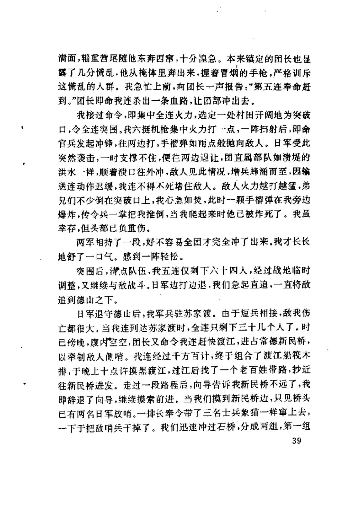 我接过命令,即集中全连火力,选定一处村田开阔地为突破口,令全连突围。我六挺机枪集中火力打一点,一阵扫射后,即命官兵发起冲锋,往两边打,手榴弹如雨点般抛向敌人。日军受此突然袭击,一时支撑不住,便往两边退让,团直属部队如溃堤的洪水一样,顺着溃口往外冲,敌人见此情况,增兵蜂涌而至,因输送连动作迟缓,我连不得不死堵住敌人。敌人火力越打越猛,弟兄们不少倒在突破口上,我心急如焚,此时一颗手榴弹在我旁边爆炸,传令兵一掌把我推倒,当我爬起来时他已被炸死了。我虽幸存,但头部已负重伤。