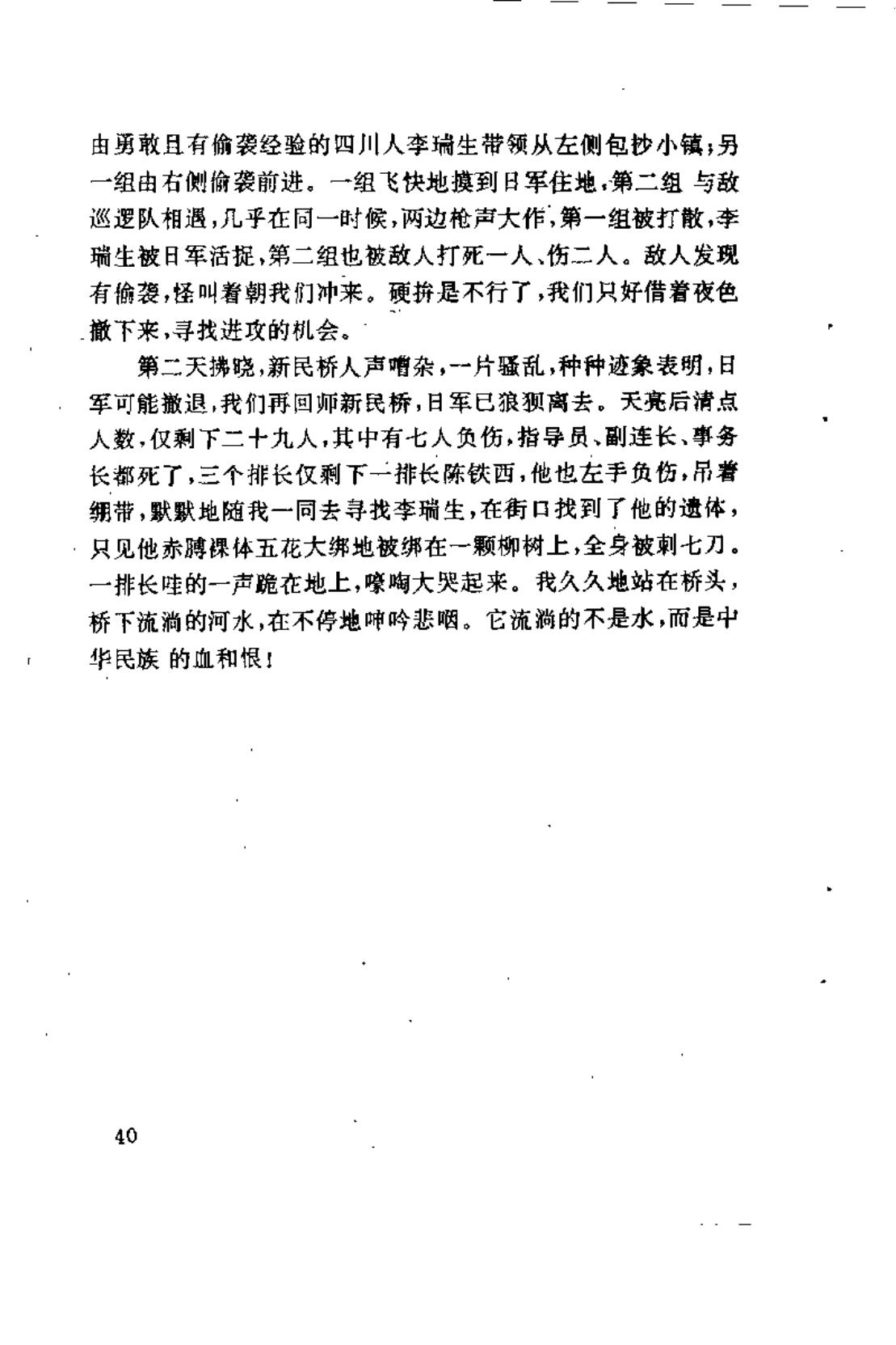 第二天拂晓,新民桥人声噌杂,一片骚乱,种种迹象表明,日军可能撤退,我们再回师新民桥,日军已狼狈离去。天亮后清点人数,仅剩下二十九人,其中有七人负伤,指导员、副连长、事务长都死了,三个排长仅剩下一排长陈铁西,他也左手负伤,吊着绷带,默默地随我一同去寻找李瑞生,在街口找到了他的遗体,只见他赤膊裸体五花大绑地被绑在一颗柳树上,全身被刺七刀。一排长哇的一声跪在地上,嘹啕大哭起来。我久久地站在桥头:桥下流淌的河水,在不停地呻吟悲咽。它流淌的不是水,而是中华民族的血和恨!