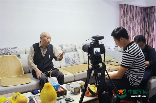 在江苏省南通市,工作人员向抗战老兵程雪青了解战斗故事细节。来碧荣 摄