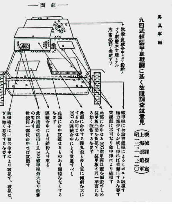 每一个X符号代表被击中一弹,可以看到日军战车中弹如同马蜂窝 -- 可惜啊,要咱有反坦克枪那这玩意儿拆了可以直接当笊篱也 -- 并且确实有多处损伤和贯通,但这辆日军战车最终还是开了回去。这一方面反映了中国军队在作战中不乏勇气,而且射击准确,看日军战车观察窗周围密集的弹孔就 可以感受当时的战斗,日军车长就在观察窗中被一弹毙命 -- 八十八师是德械精锐,训练有素,确实不是好惹的。但是也反映了中国军队轻武器反战车能力的不足。