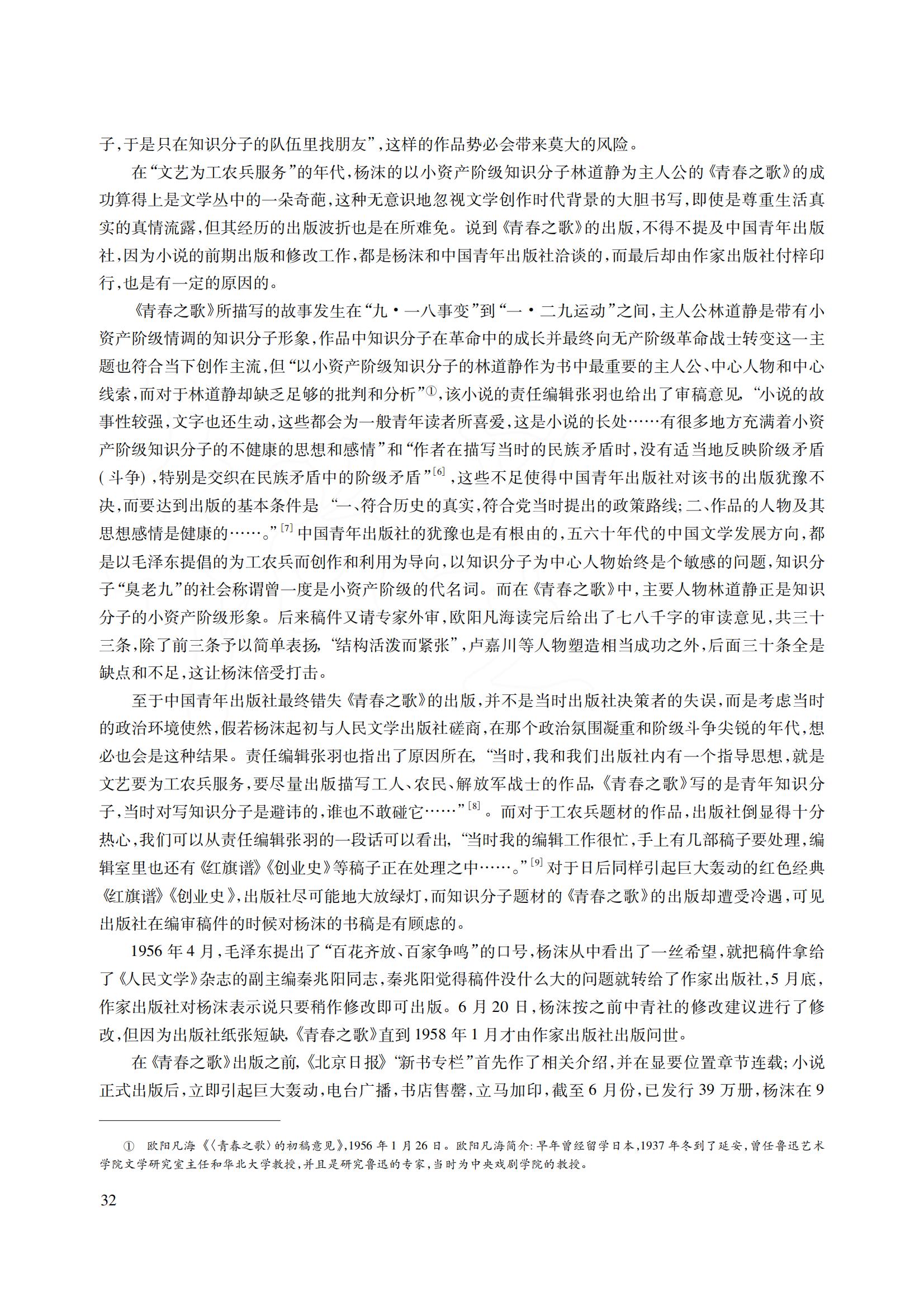 《青春之歌》所描写的故事发生在“九·一八事变”到“一·二九运动”之间,主人公林道静是带有小资产阶级情调的知识分子形象,作品中知识分子在革命中的成长并最终向无产阶级革命战士转变这一主题也符合当下创作主流,但“以小资产阶级知识分子的林道静作为书中最重要的主人公、中心人物和中心线索,而对于林道静却缺乏足够的批判和分析”*,该小说的责任编辑张羽也给出了审稿意见,“小说的故事性较强,文字也还生动,这些都会为一般青年读者所喜爱,这是小说的长处……有很多地方充满着小资产阶级知识分子的不健康的思想和感情”和“作者在描写当时的民族矛盾时,没有适当地反映阶级矛盾(斗争),特别是交织在民族矛盾中的阶级矛盾”[6],这些不足使得中国青年出版社对该书的出版犹豫不决,而要达到出版的基本条件是:“一、符合历史的真实,符合党当时提出的政策路线;二、作品的人物及其思想感情是健康的……。”[7]中国青年出版社的犹豫也是有根由的,五六十年代的中国文学发展方向,都是以毛泽东提倡的为工农兵而创作和利用为导向,以知识分子为中心人物始终是个敏感的问题,知识分子“臭老九”的社会称谓曾一度是小资产阶级的代名词。而在《青春之歌》中,主要人物林道静正是知识分子的小资产阶级形象。后来稿件又请专家外审,欧阳凡海读完后给出了七八千字的审读意见,共三十三条,除了前三条予以简单表扬,“结构活泼而紧张”,卢嘉川等人物塑造相当成功之外,后面三十条全是缺点和不足,这让杨沫倍受打击。
