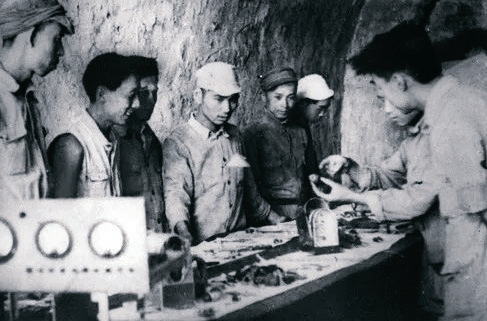 图为延安通信材料厂的技术人员在窑洞中制造通信器材 资料图片