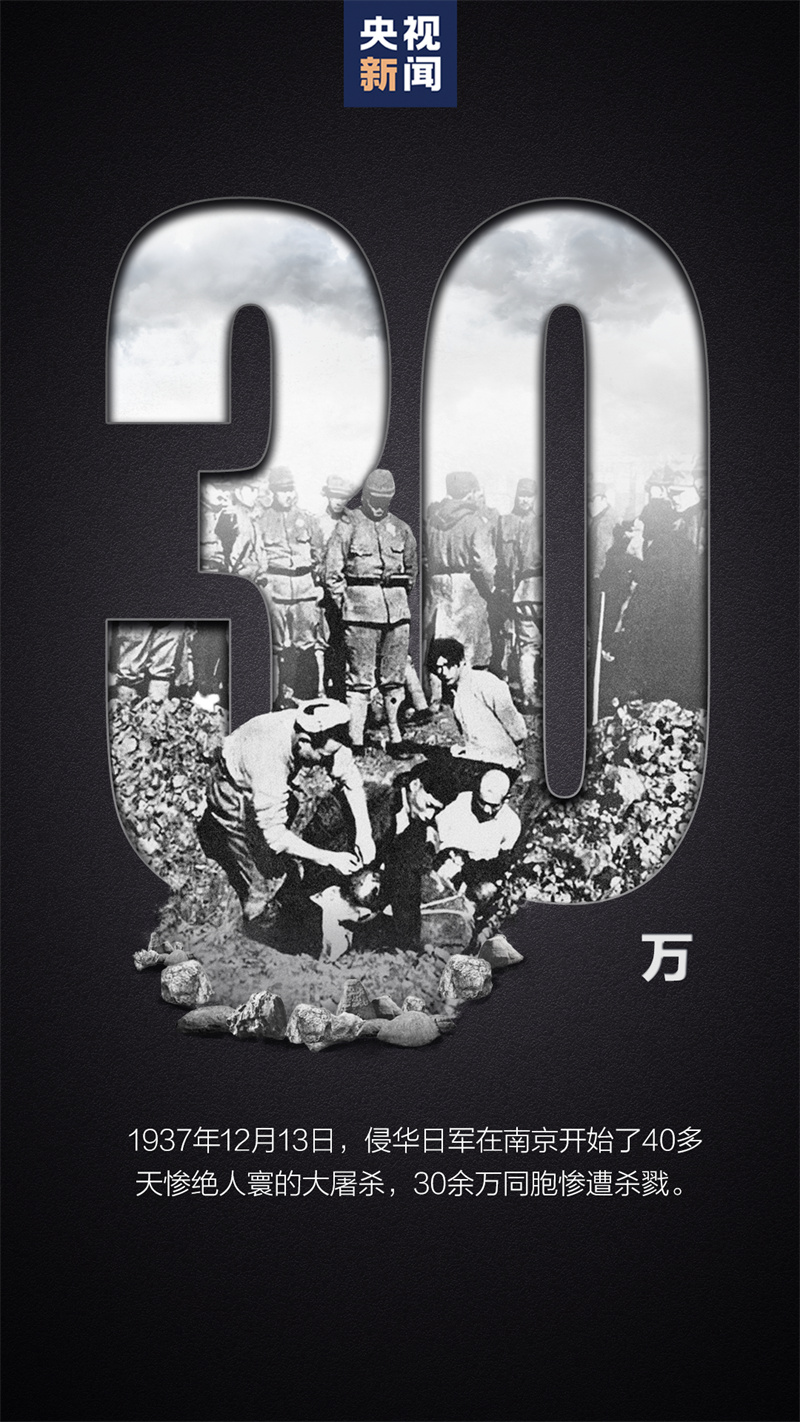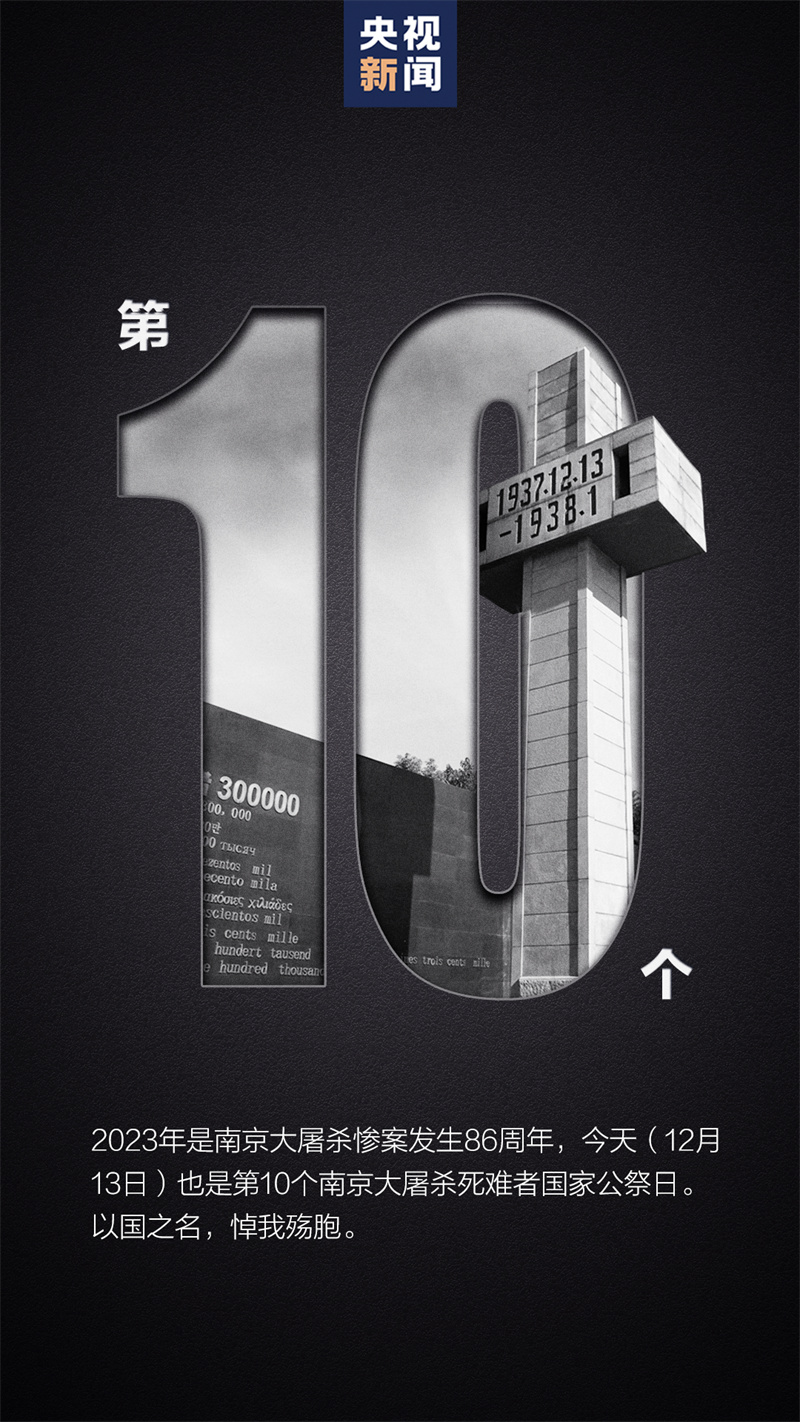 今天(2023年12月13日)是第10个南京大屠杀死难者国家公祭日。86年前,侵华日军制造了惨绝人寰的南京大屠杀,30多万同胞罹难,短短6周内,昔日繁华的古都就变成了人间炼狱,平均每12秒就有一名中国人被杀害……每一个数字,都在提醒着我们,沉痛的记忆,不应随着时间的流逝而湮灭。此刻,通过一段史实,一组数字,再来见证祖辈和同胞流过的血、亲历的痛,铭记历史,捍卫真相。