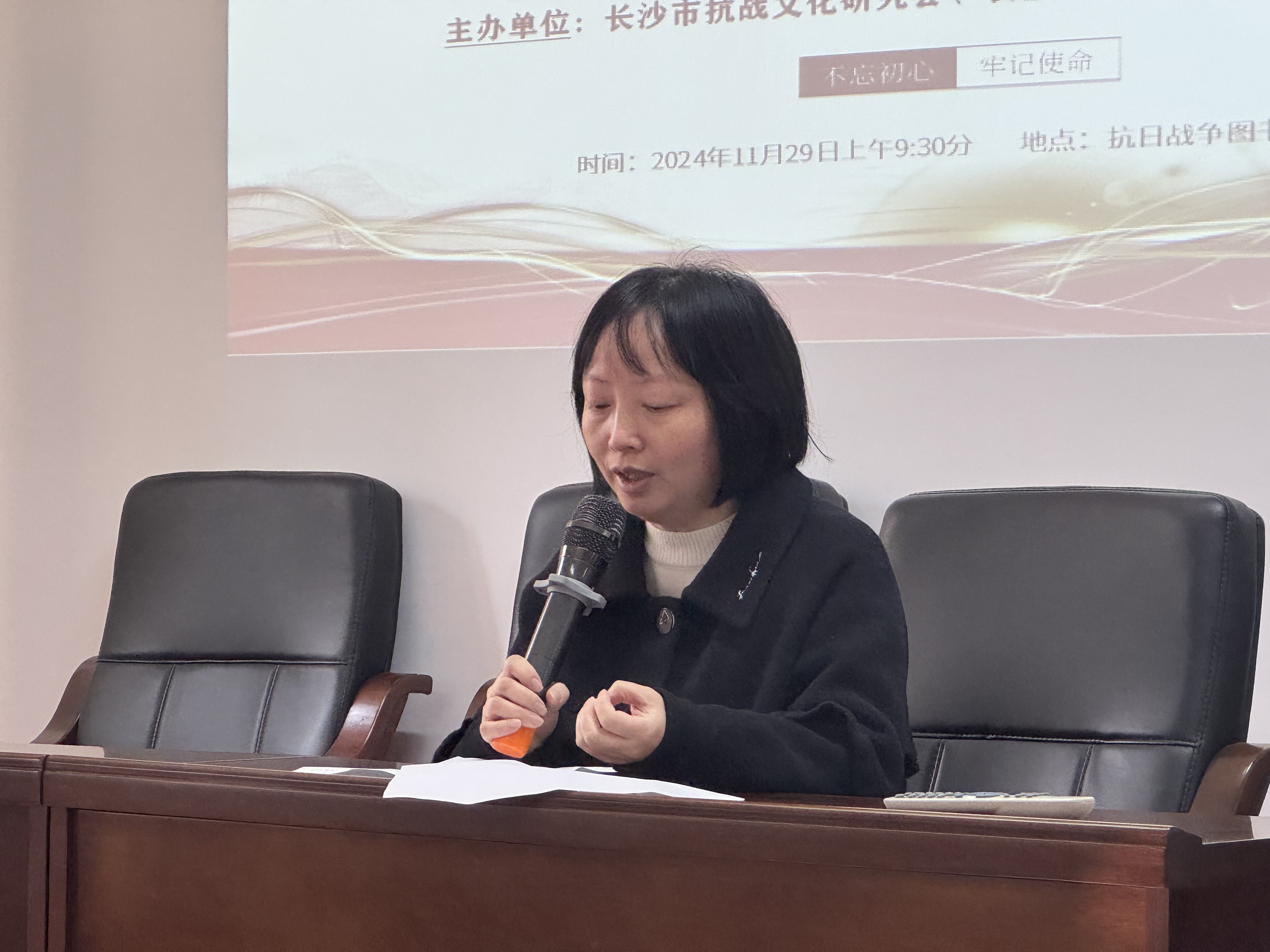 抗日战争纪念网总编、抗日战争图书馆馆长、长沙市抗战文化研究会会长何誉军发言,表示将继续努力加强抗战历史资料的收集、整理和传播,以让大家牢记用鲜血和生命铸就的中国人民抗日战争的伟大历史,牢记中国人民为维护民族独立和自由、捍卫祖国主权和尊严建立的伟大功勋,牢记中国人民为世界反法西斯战争胜利作出的伟大贡献,引领大家弘扬伟大抗战精神,在铭记历史中开创未来,捍卫民族尊严和荣誉,推动人类发展与进步。