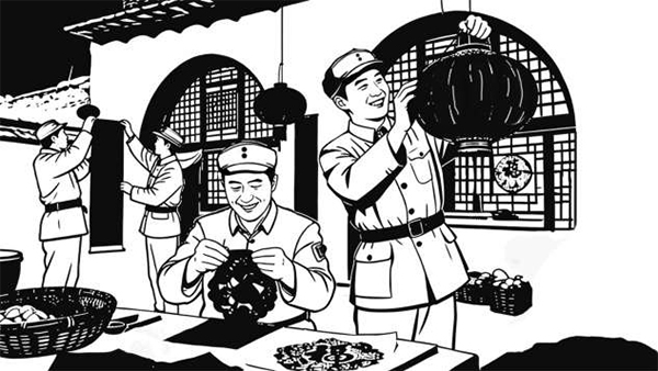 八路军战士们除了搞好战备训练,还想方设法置备过年的食品。当时,警卫部队有一个长枪连,正式名称为“中央警卫长枪连”,是抗日战争时期为保障中共中央领导和机关安全而设立的特殊警卫部队。连队成员是经过严格筛选的,要求政治可靠、军事素质过硬,多为经历过长征或长期参加革命斗争的骨干。他们主要负责中央首长的外围警戒和安全保卫工作,对中共中央机关、重要会议场所、通信设施等进行警卫,防止敌方破坏或袭击。长枪连的一百多名战士,每天操练、站岗,生活极为清苦。由于刚组建不久,家底薄,长枪连过年就只买了20斤肉,每人还分不上2两。就在连里为此发愁时,管理中央首长生活的同志抬着半扇猪肉来了。大家正疑惑间,来送肉的工作人员说:“昨天小灶杀了一口猪,毛主席让送给你们一些过年用。”原来,这是毛泽东同志特意嘱咐给大家送来的。战士们听了都非常感动。因为他们平常在警卫工作中都知道,中央首长平日也吃不到荤。毛泽东的生活非常简单,就是一点蔬菜或辣椒。于是,连队开会讨论时,不知是谁说了句:“请毛主席吃年饭以示感谢。”大伙不约而同都说好,并把这个任务交给了连政治指导员张久厚。