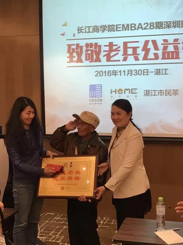 2016年11月30日,长江商学院EMBA28期深圳班60位企业家,在湛江市民革政协委员、深圳市龙越慈善基金会、湛江关爱抗战老兵志愿者团队陪同下,到湛江探访抗战老兵,给老兵们送上祝福,一起聆听老兵讲述抗战故事,重温民族记忆。