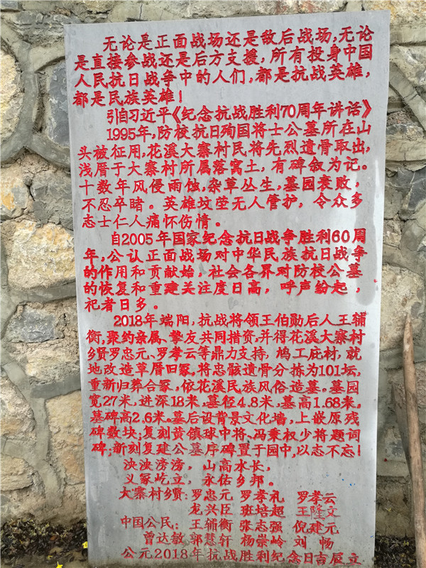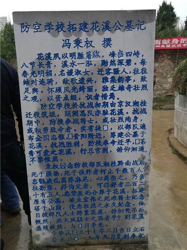 2005年,中国人民抗日战争胜利60周年,社会各界对防校公墓的恢复和重建关注度日高,呼声纷起。贵州安龙籍抗日将领王伯勋之子王辅衡,在辗转数年奔走呼号,聚约亲属、挚友共同捐资,并得大寨村乡贤罗忠元、罗孝云等鼎力支持,贵州关注抗战老兵志愿者慰问团的志愿者也自发积极参与,将忠骸遗骨重新归葬合冢,依花溪民族风俗造墓。墓后设背景文化墙,上嵌原墓残碑数块;复刻黄镇球中将、冯秉权少将题词碑;新刻复建公墓序碑置于园中,以志不忘。2021年清明节“防空学校抗战殉国将士公墓”重新出现在人们视野中,供世代缅怀,永远铭记!
