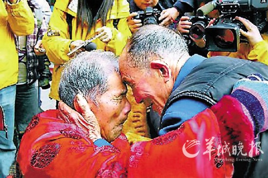 相拥。几十年岁月,多少艰难曲折、雨雪风霜,才得以重逢,一泡热泪在心头。