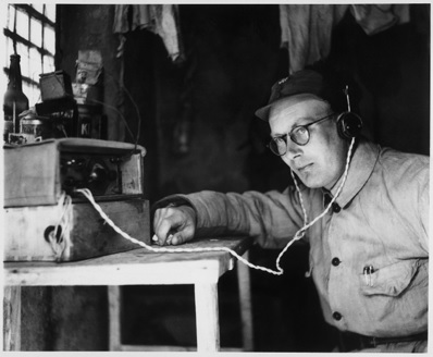 林迈可使用自己制造的电台发报。 1938-39年 沙飞摄