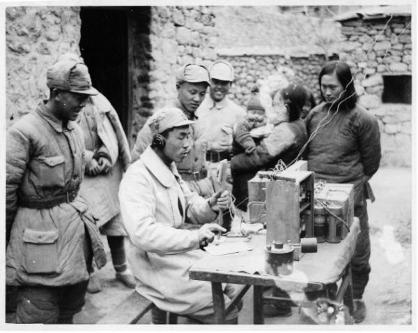 晋察冀军区第三分区电台台长梁骥在试验小型电台。林迈可是晋察冀军区无线电技术指导顾问。 1943年