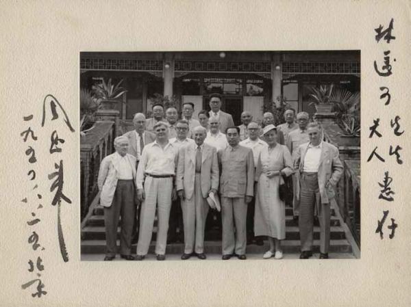 1954年,林迈可夫妇随英国工党代表团访华。周恩来总理会见以工党领袖前首相艾德礼为首的代表团全体人员,在中南海合影。这是周恩来赠送给林迈可夫妇的合影照片。