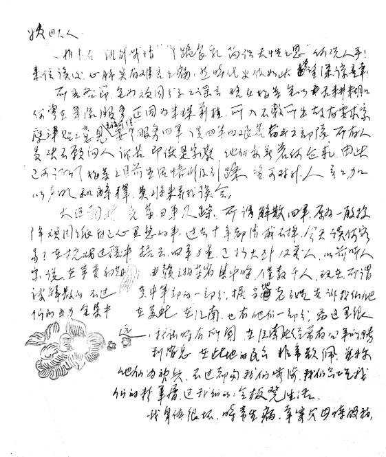 “人非木石,孰能无情?”“羊跪食乳,尚识天性之恩”,何况人乎!来信读后,心肺实存难言之痛!然时代迫使如此,曾望深谅是幸!所言各节,全为顽固分子之谣言,现在梅等全以舌耕糊口 ,何曾在军队服务?正因为米珠薪桂 ,所入不敷所出,故有要求家庭津贴之意见见诸前信;要是服务四军 ,谈四军的艰苦奋斗之部队,所有人员决不愿向人诉苦,即使是家庭,他们亦无若何企求。由此已可证明梅等之目前生活情形及行踪,望可对外人言之,加以声明和解释,莫将来弄成误会。大江南北尽第四军足踪。