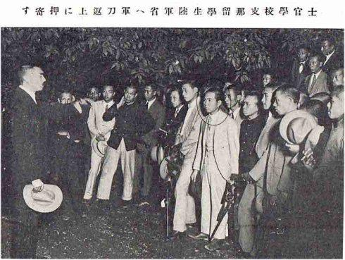 画面上,一边是留着仁丹胡的日本官员,另一边是表情严肃的中国士官生们。可以看到士官生们有人手里提着佩刀,显然是准备“掷还”给日本人的。