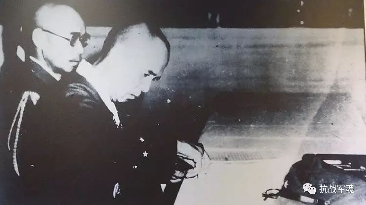 9时07分,冈村宁次打开《日本投降书》,小林浅三郎在一旁磨墨,动作有些僵硬。冈村宁次一边匆匆翻阅降书,一边取笔欲蘸墨,却突然盯着毛笔怔了起来,手也颤抖起来,后来可能是为了掩饰紧张,他顺手捏下了笔头的几根羊毫,恭恭敬敬签下自己的名字后,他伸出双手解上衣右上侧口袋的扣子,解了半天,取出方章来,蘸了红色的印泥,终于哆哆嗦嗦地盖到了投降书上,不想印章却稍稍盖歪了,冈村宁次面部微露难色,但已无可奈何。他站起身,恭立着,一面命令小林浅三郎呈递降书,一面朝长桌对面的何应钦点头。