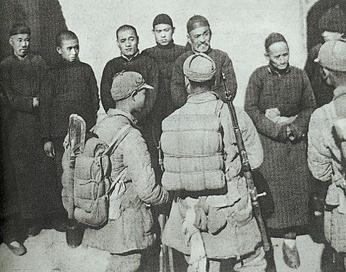 一九四三年冬,山东清河军区主力部队攻入滨县、蒲台一带。这是战士们向人民群众宣传我党抗日政策时的情形