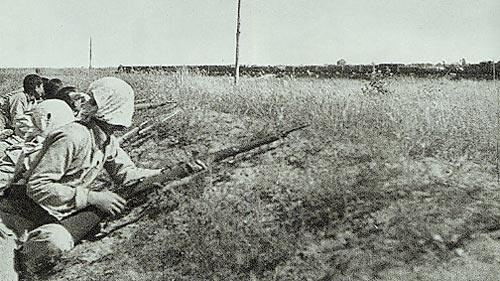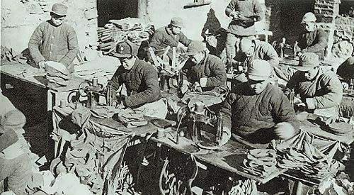我军的被装,一部分靠人民群众加工制做,一部分靠被服厂生产;由于财力和原料缺乏,还要K部队指战员自己动手生产和修补。这是被服厂女工在纳鞋底