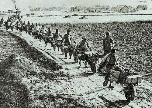 肩背手推和牲畜驮运是我军抗日战争时期运输勤劳的主要形式。这是根据地人民组织的小车队运送支前物资