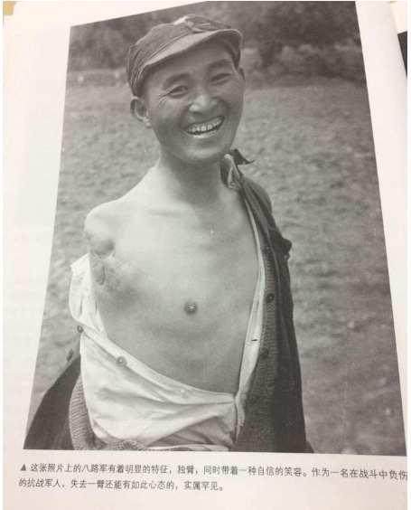 在战争中失去手臂的八路军战士,但他脸上却充满着自信的笑容,因为他坚信八路军是抗日的主力军。