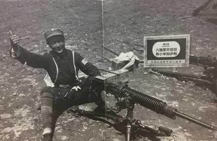 一名八路军战士展示缴获的重机枪,他竖起大拇指,看来他对这枪十分满意。