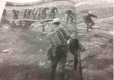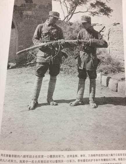 八路军战士穿着草鞋,在仔细看着缴获的日军军刀。