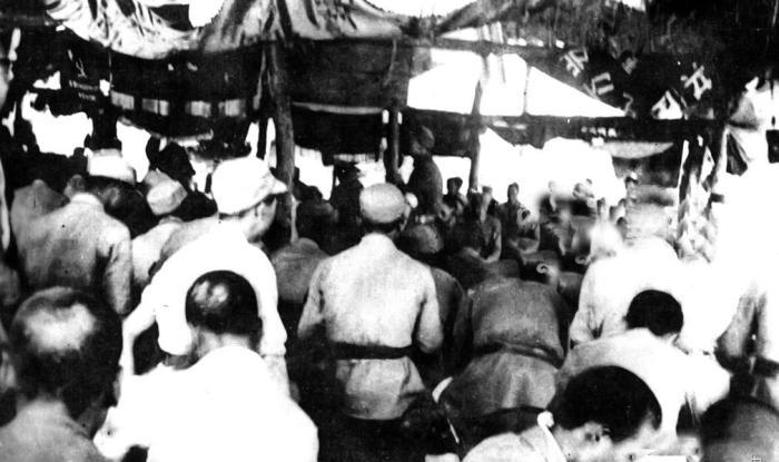 这次党代会总结了新四军同敌斗争中所取得的成果和经验,并找出存在的问题和不足;传达了党的六届六中全会精神;讨论研究了今后的工作和任务。图为1939年7月23日,新四军政治部主任袁国平在第一次党代会大会上作《过去党的工作总结及今后党的建设》的报告。