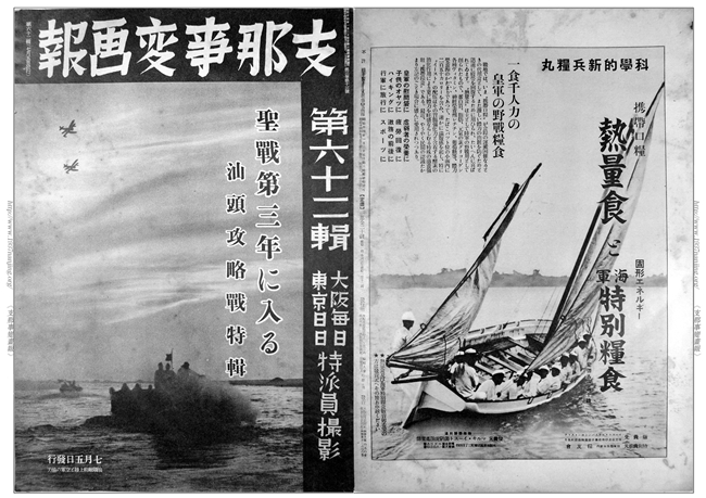 《支那事变画报》译为《中国事变画报》,创刊于日本昭和12年8月3日(1937年8月3日)。创刊号封面上印有“陆军省许可、支那驻屯军司令部许可和发行所大坂每日新闻社、东京日日新闻社”字样,2—100辑封面上均标明为“大坂每日、东京日日特派员摄影”。《支那事变画报》临时增刊为周刊朝日,发行所为大坂、东京朝日新闻社。《支那事变画报》在日本国内印刷后运到中国发行。