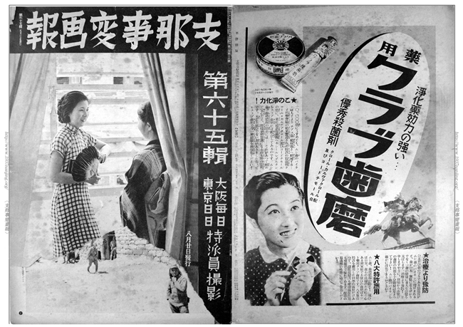 《支那事变画报》译为《中国事变画报》,创刊于日本昭和12年8月3日(1937年8月3日)。创刊号封面上印有“陆军省许可、支那驻屯军司令部许可和发行所大坂每日新闻社、东京日日新闻社”字样,2—100辑封面上均标明为“大坂每日、东京日日特派员摄影”。《支那事变画报》临时增刊为周刊朝日,发行所为大坂、东京朝日新闻社。《支那事变画报》在日本国内印刷后运到中国发行。