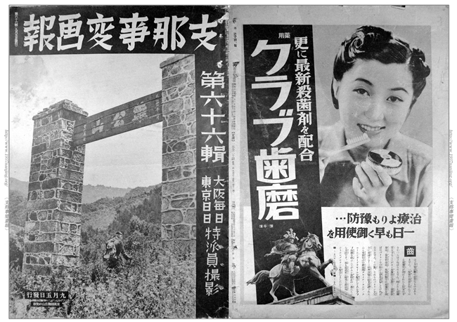 《支那事变画报》译为《中国事变画报》,创刊于日本昭和12年8月3日(1937年8月3日)。创刊号封面上印有“陆军省许可、支那驻屯军司令部许可和发行所大坂每日新闻社、东京日日新闻社”字样,2—100辑封面上均标明为“大坂每日、东京日日特派员摄影”。《支那事变画报》临时增刊为周刊朝日,发行所为大坂、东京朝日新闻社。《支那事变画报》在日本国内印刷后运到中国发行。