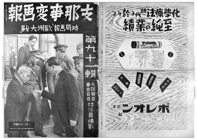 《支那事变画报》译为《中国事变画报》,创刊于日本昭和12年8月3日(1937年8月3日)。创刊号封面上印有“陆军省许可、支那驻屯军司令部许可和发行所大坂每日新闻社、东京日日新闻社”字样,2—100辑封面上均标明为“大坂每日、东京日日特派员摄影”。《支那事变画报》临时增刊为周刊朝日,发行所为大坂、东京朝日新闻社。《支那事变画报》在日本国内印刷后运到中国发行。