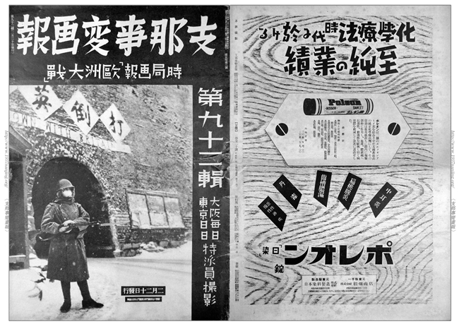 《支那事变画报》译为《中国事变画报》,创刊于日本昭和12年8月3日(1937年8月3日)。创刊号封面上印有“陆军省许可、支那驻屯军司令部许可和发行所大坂每日新闻社、东京日日新闻社”字样,2—100辑封面上均标明为“大坂每日、东京日日特派员摄影”。《支那事变画报》临时增刊为周刊朝日,发行所为大坂、东京朝日新闻社。《支那事变画报》在日本国内印刷后运到中国发行。