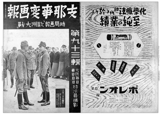 《支那事变画报》译为《中国事变画报》,创刊于日本昭和12年8月3日(1937年8月3日)。创刊号封面上印有“陆军省许可、支那驻屯军司令部许可和发行所大坂每日新闻社、东京日日新闻社”字样,2—100辑封面上均标明为“大坂每日、东京日日特派员摄影”。《支那事变画报》临时增刊为周刊朝日,发行所为大坂、东京朝日新闻社。《支那事变画报》在日本国内印刷后运到中国发行。