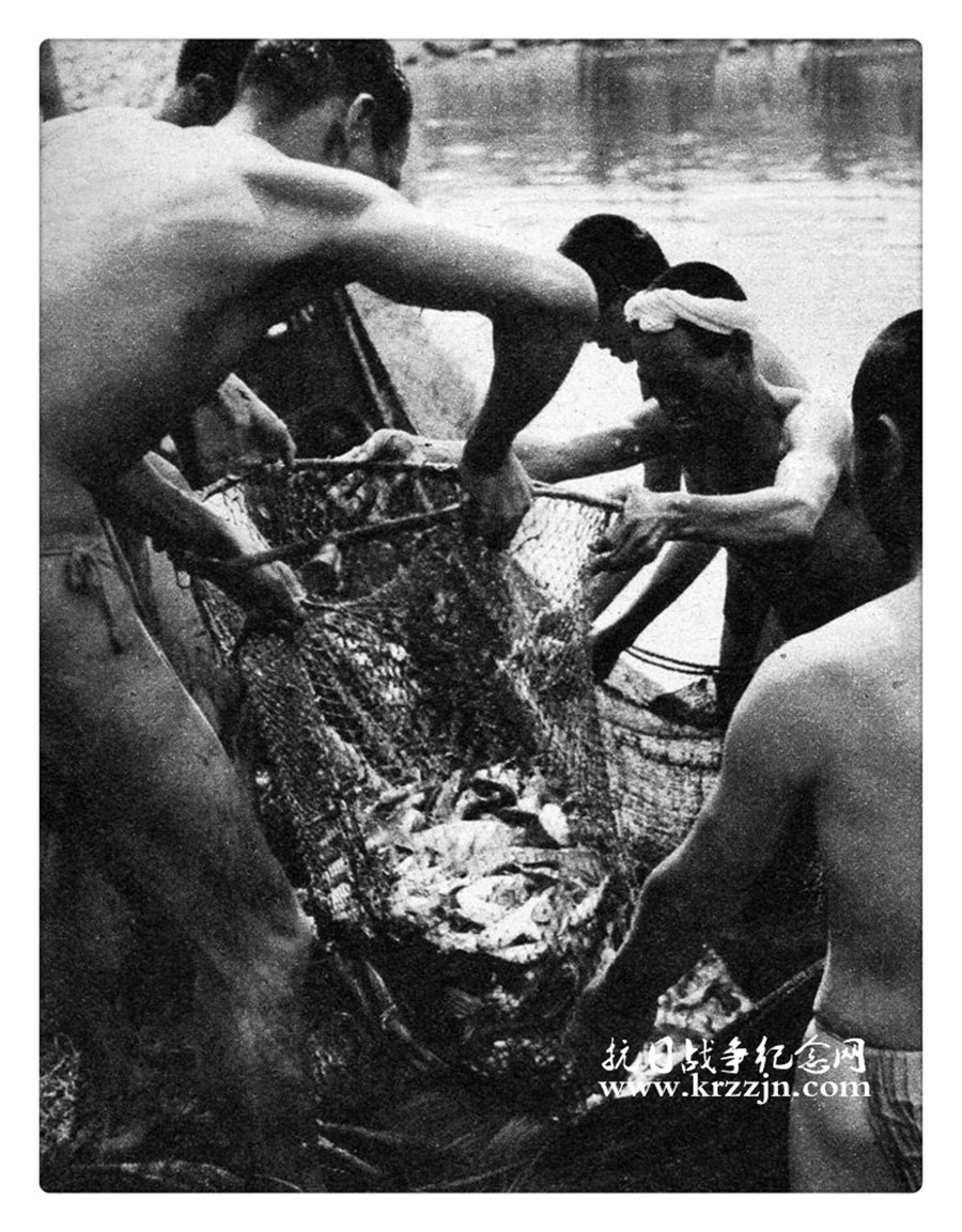 1938年11月,广东佛山,从百姓池塘内捕鱼的日军士兵。3